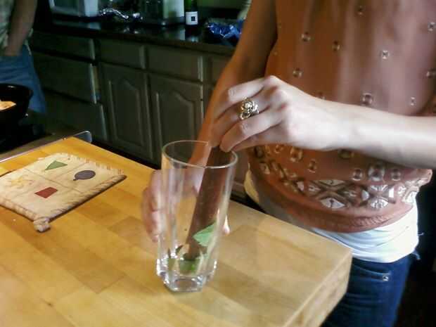 Para ello, colocar unas hojas de menta en el fondo de cada vaso y machacar un embrollo embrollo. Si no tienes un lío, sólo use un tenedor para básicamente Pulse y romper las hojas de menta en el fondo del vaso y hacia los lados. Esto libera la esencia y el sabor de las hojas de menta. MMM Mmm... frescura de menta.