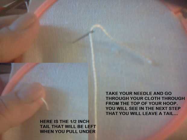 Las dos fotos de aquí muestran cómo llevar la aguja hacia abajo desde la parte superior de su aro y te guarde cola.
