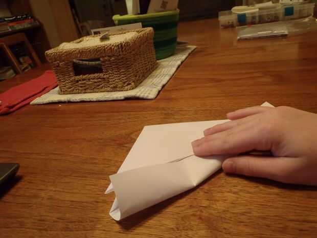 En tercer lugar, debe haber papel extra en la parte inferior. Doble hasta el borde del triángulo. Luego, doblar los bordes del dos triángulo, hacer un diamante.