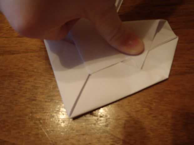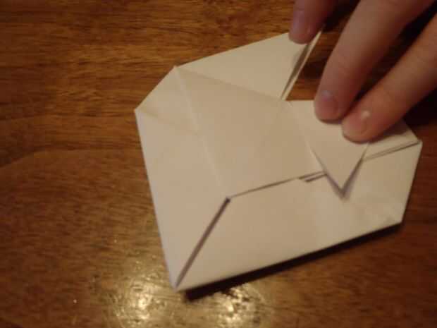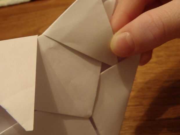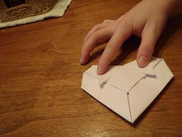 En sexto lugar, doblar la parte superior izquierda, y derecha triángulo abajo, los extremos estar paralelo a los lados. Después de eso, deslice las puntas dentro del bolsillo que acabamos de crear en el paso antes.