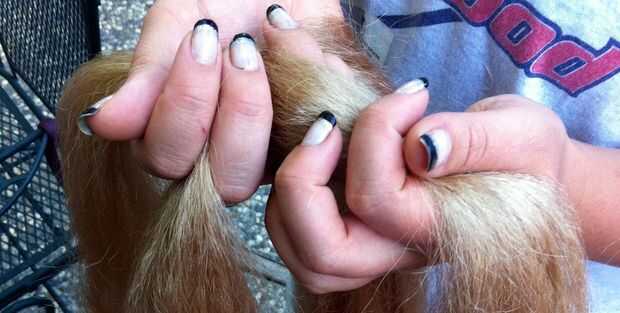 Inicio con el pelo como el menos (el resaltado de pelo, para mí). Separado en tres ramas separadas, igual tamaños. Les cuelgue sobre algo (por ejemplo, el respaldo de una silla), individualmente.