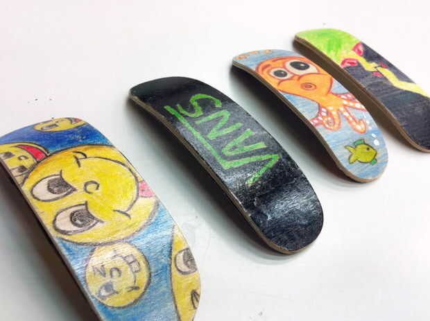 Acabado su junta con cinta adhesiva algunas limpia papel de lija en la parte superior, añadir un llavero o solo la correa a su estuche. También puede agregar algunos carros (para profesores: 100 piezas por unos 30$ en ebay, o simplemente explotar algunos fingerboards de cubierta vieja de tecnología) y comenzar una carrera como un skater profesional de clase mundial.