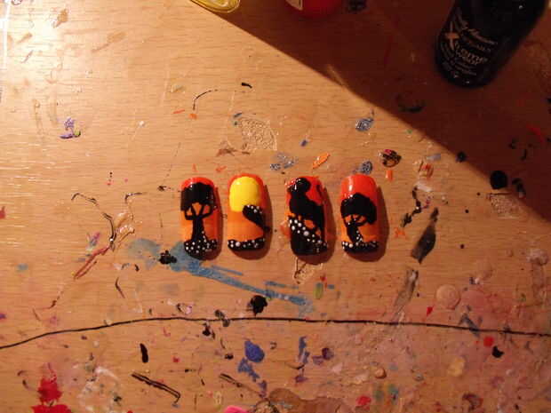 de uñas es divertido! No soy muy bueno en el arte de uñas pero pensé que sería divertido intentar algo que no sea esmalte para uñas. Por lo tanto, utilicé pintura de tela dorada con esmalte de uñas negro. Puede utilizar pintura de brillo también. Mis