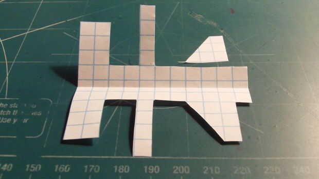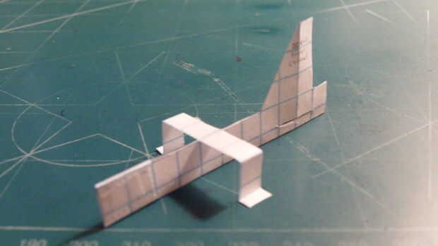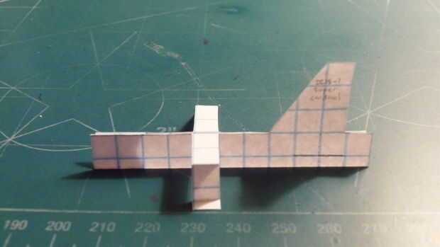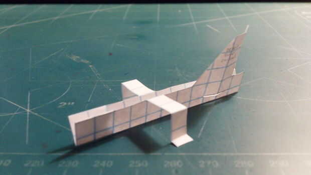 Después de haber cortado todo el fuselaje, cortó el estabilizador vertical extra y comenzar a doblar por la línea punteada. Luego doblar hacia adelante las trasera 2 cajas y corte a lo largo de la línea. Para ello, doblando el fuselaje a la derecha, hacer un corte y doblar a la izquierda. Entonces cinta su fuselaje juntos en el frente, hacia atrás y a través del fuselaje en la aleta.