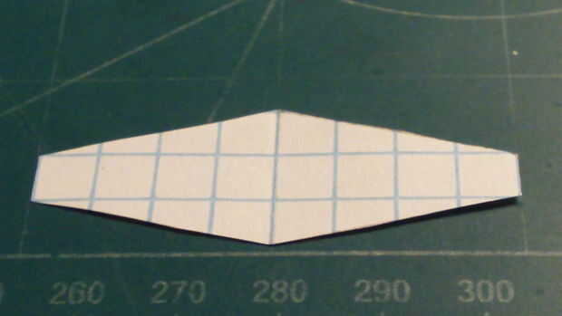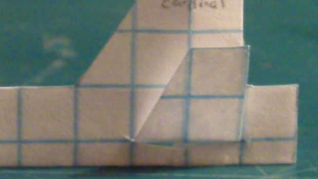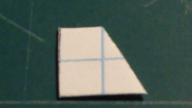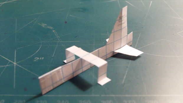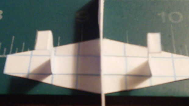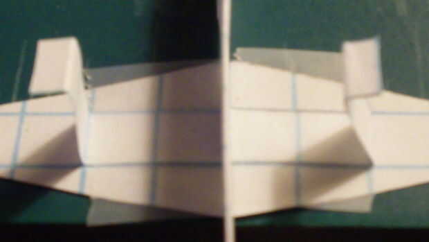 Cortar la cadena formuló a través del corte por debajo del timón y estabilizadores horizontales. Luego doble hacia arriba y aplique la cinta como se muestra. Una vez terminados los estabilizadores horizontales, recortar el ala como se muestra. Aplicará el fuselaje a la parte inferior de la hoja con cinta adhesiva. Corte cualquier exceso cinta. El cardenal súper está ahora completa.