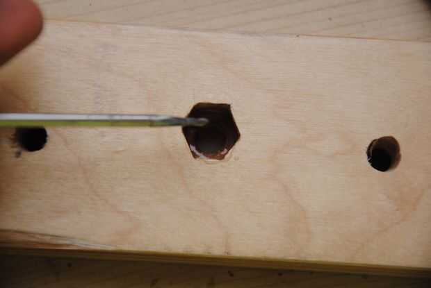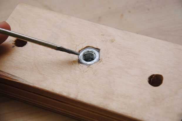 Después de eso, solía un 5mm cincel y mazo de madera caseros mi cincel un orificio en forma de las tuercas de maleficio en la madera, la profundidad del agujero debe ser cincelada a la altura exacta de ambos de las tuercas de maleficio cuando están apilados uno encima del otro.