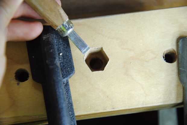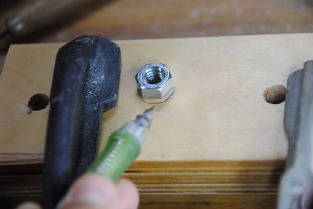 Me aseguré de que el agujero de la tuerca hexagonal fue alineado perfectamente sobre el agujero que previamente perforado. Entonces trazó el contorno de la tuerca hexagonal sobre el agujero.