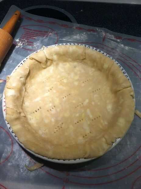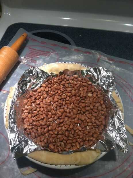 Recortar la corteza y la bola de los desechos y ponerlos en el congelador para un enfriamiento rápido hacia abajo.  Empujar los agujeros en la corteza con un tenedor para minimizar resoplando mientras cocina.  Para mantener su forma también añadir una capa de papel de estaño a la corteza y luego una bolsa de frijoles o pesas de pie.  No tengo pesas de pie pero tengo granos.  De hecho estas son cuádruples al horno frijoles como he usado en los últimos 4 pasteles que he hecho.  Dejar que enfriar y rebag para su uso posterior.