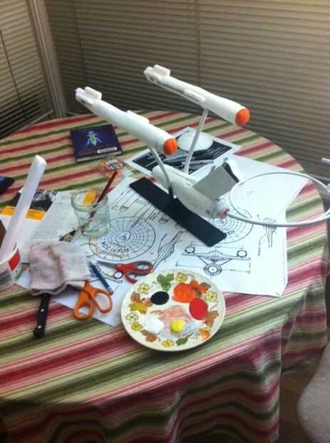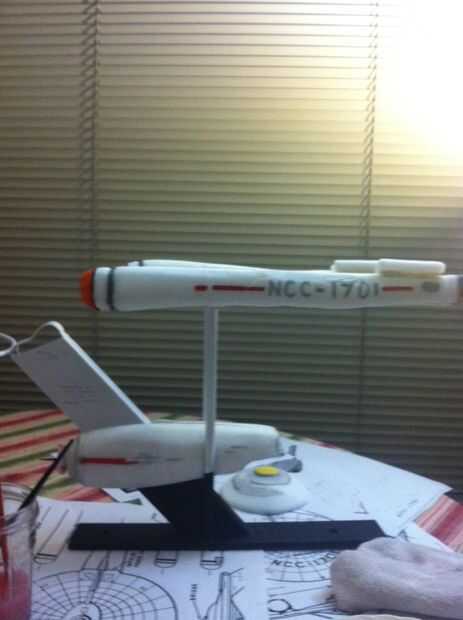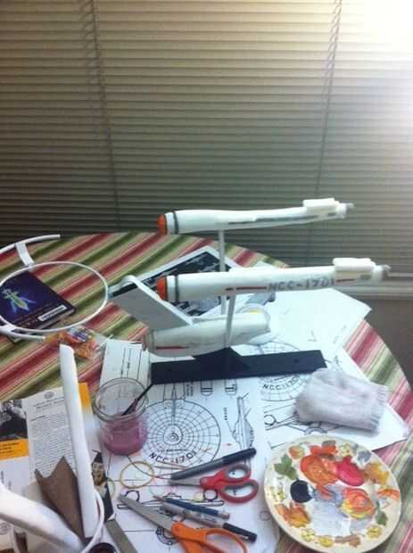 ¿Qué haces?Hice un modelo de cartón de la USS Enterprise de Star Trek con Make 123D.  Es accionadas por un arduino de luces parpadeantes. Vea la foto porque una imagen vale 1 mil palabras.  Una vez pintado,abelled y espacio n suspendido, parece casi