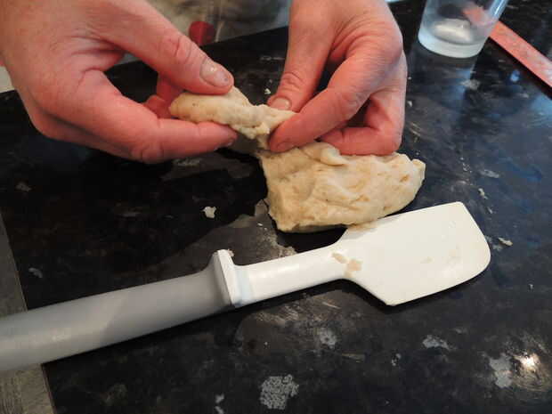 Llano cerca de 8 onzas de harina (pero puede variar. Añadir hasta que se forma una pasta gruesa dougy)