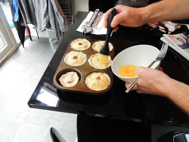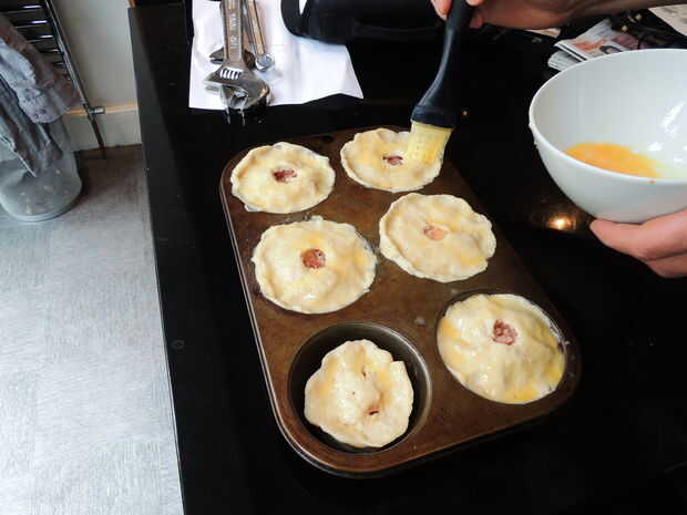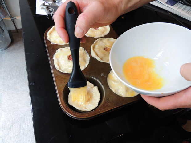 Esmalte las empanadas con un montón de huevo batido, que ha sido bien condimentada con sal.