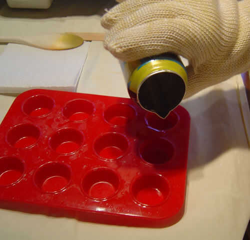 Recoger su puede y vierta la mezcla de cera en los moldes. Generalmente mina llenar aproximadamente 3/4. Si usted derrama alguna dejarlo, despréndalo de la superficie está en y poner de nuevo en el poder para derretir en la próxima vez que haga medio.