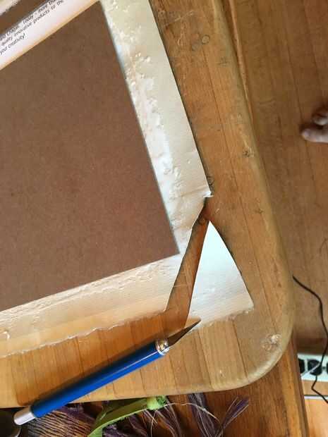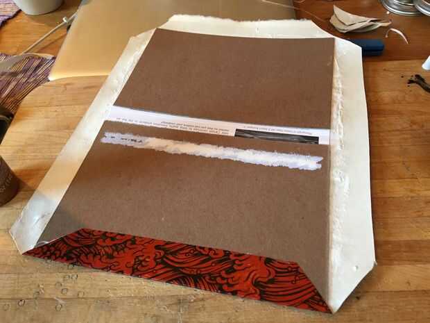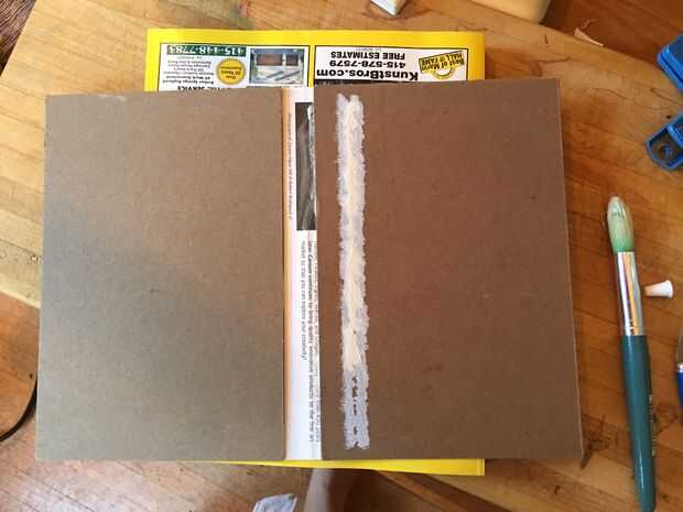 Pegar las tablas de la cubierta sobre la columna vertebral, aproximadamente una octava parte de una pulgada fuera de los pliegues. Luego pegamento en el papel o tela o lo que usas. Recortar las esquinas con un ángulo de 45 grados para que pueda doblar encima y adhiera perfectamente. Todo liso cuidadosamente después de pegar y deje secar.