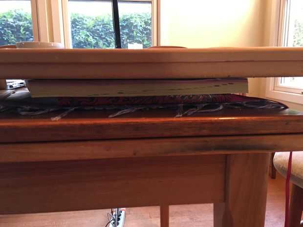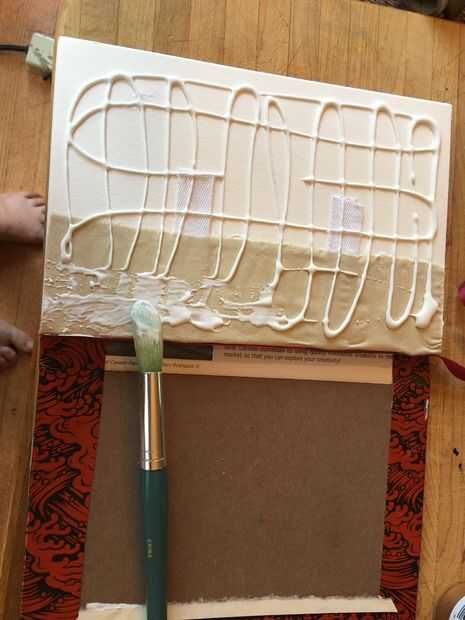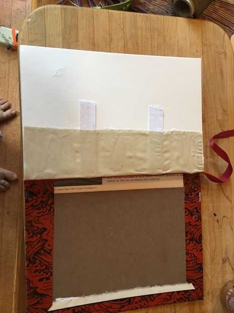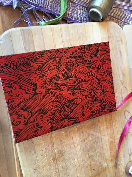 Primero, pegue las cintas del libro hacia el exterior de las firmas de la primeras y la últimas. Luego adhiera la tela en la parte superior. Ahora a poner pegamento sobre la tela, cubriendo completamente la primera y última página, pero no la columna vertebral. Cuidadosamente ponga el libro en su cubierta y el peso cerró para que se sequen de plano. Utilicé unas tablas y un libro de teléfono.