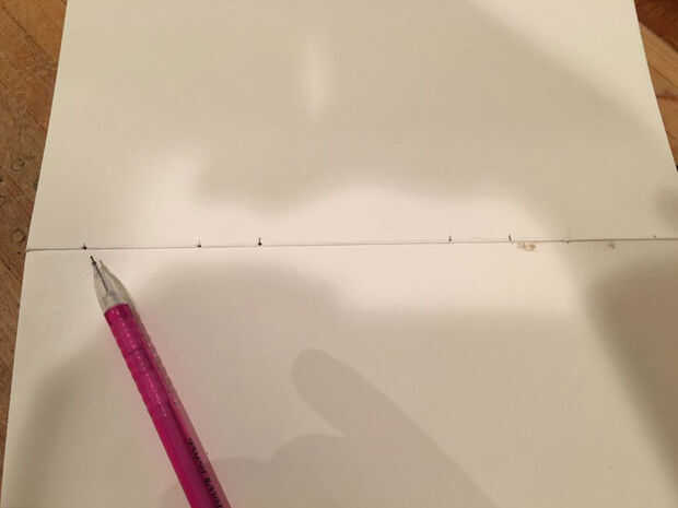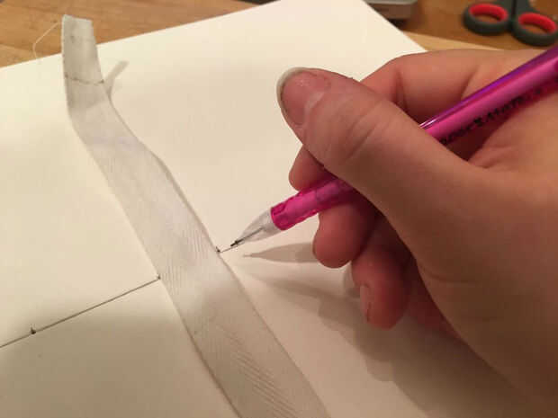 Primera marca donde los agujeros se van en una de sus firmas. Se necesita un agujero en la parte superior, un agujero en la parte inferior y dos agujeros para cada cinta que usas, uno a cada lado de donde estará la cinta. Usé dos cintas, para un total de seis agujeros.