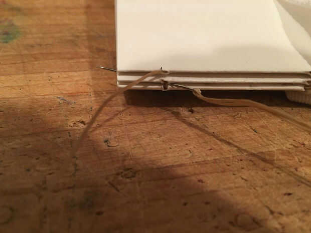 Coser el resto de las firmas como el segundo, pero al salir el último agujero de cada puntada de firma entre las dos últimas firmas, bucle el hilo alrededor de la puntada de conectarlos.