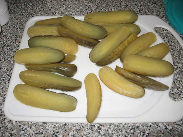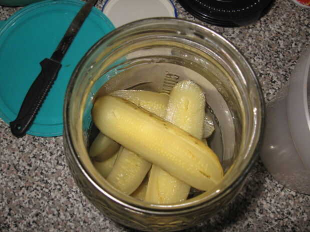 Cortar los pepinillos medio longitudinalmente y puesto nuevamente dentro de la jarra.