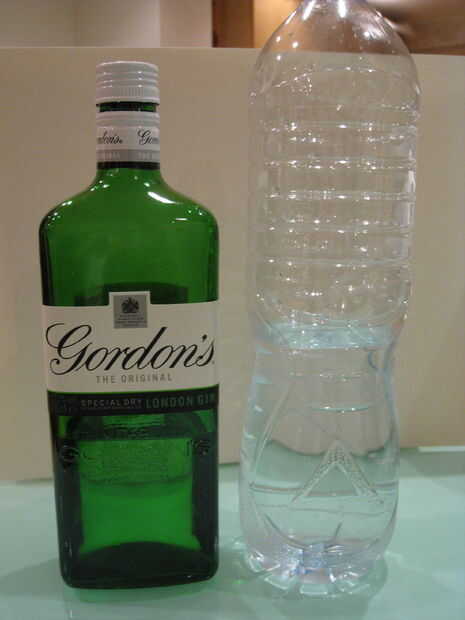 Paso 4. Tomar un litro de Ginebra y vierta la mitad de ella en una botella de agua vacía (o algo mejor si lo tienes cerca). En teoría sería mejor esterilizar la botella de agua vacía primero pero creo que gin actos como un esterilizador. Nadie que conozco alguna vez esteriliza sus botellas y están todos todavía aquí, incluso después de beber un montón de endrinas caseros.