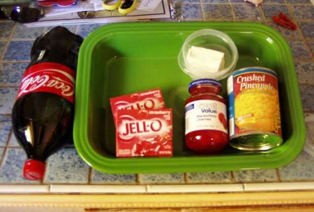 El lote que hice esta vez fue drásticamente diferente de esa receta en parte por necesidad y en parte por gusto. Caliente y agua fría y el coque se utilizan en la fabricación de la gelatina pero prefiero sustituir todos Coca Cola para el agua porque le da el plato más zing: realmente tiene un poco carbonatación en él después de hacerlo. Yo no tenía suficiente queso crema así terminó siendo corto en eso y es mi parte favorita. También pensé que tenía pedacitos de piña pero resultó para ser la piña triturada.