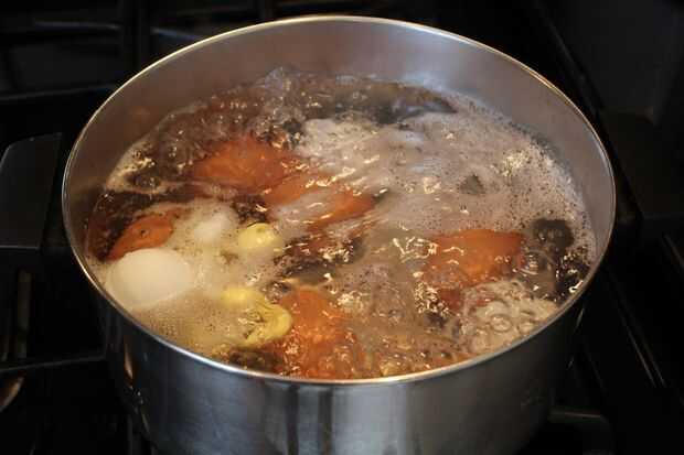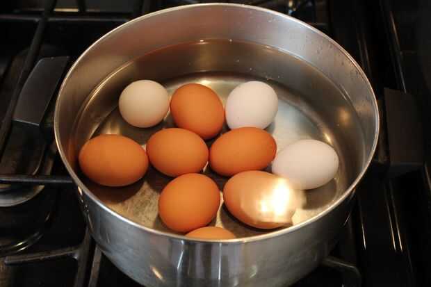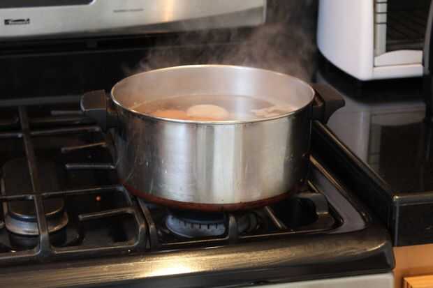 En primer lugar, tomar sus huevos crudos y colocarlos en una olla grande con agua llenada hasta aproximadamente dos pulgadas. Llevar rápidamente a ebullición, luego retire la cacerola del fuego y dejar que los huevos a terminar la cocción en el agua caliente durante otros 15 minutos.