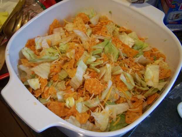 primero tuvimos ensalada taco durante una cena después de una exposición de los niños estaban en, los niños les encantó y me dieron la receta. Durante los años he adaptado y cambiado la receta para adaptarse a nuestras necesidades, pero todavía manti