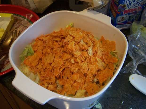 2. a continuación añadir los Doritos triturados en el bol con el queso y la lechuga y mezclar juntos