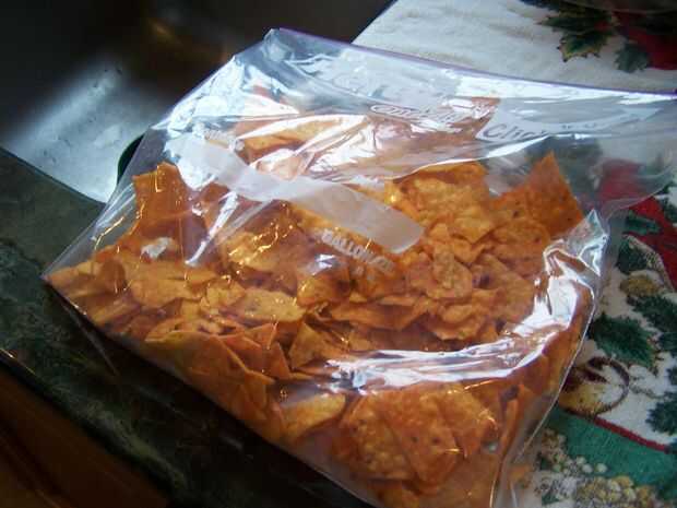 1. Ponga una buena cantidad de Doritos en una bolsa de ziplock de galones y triturar en trozos pequeños