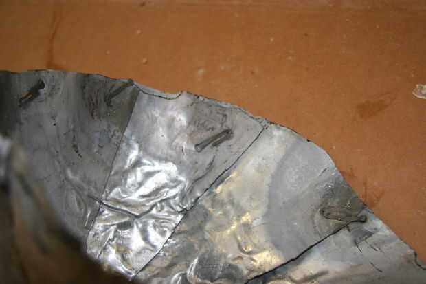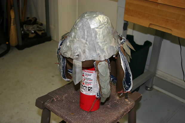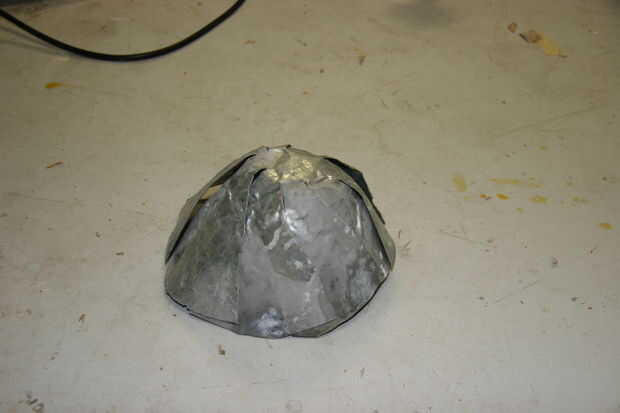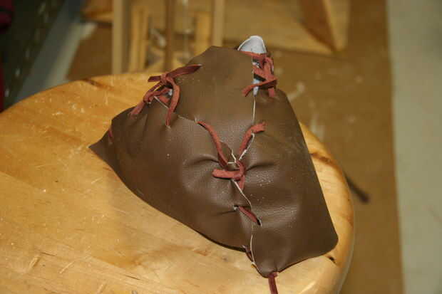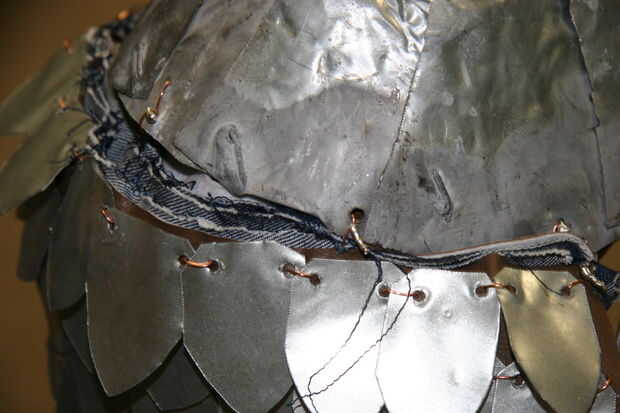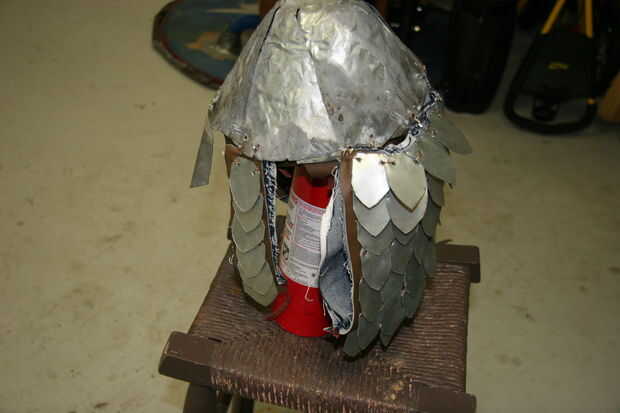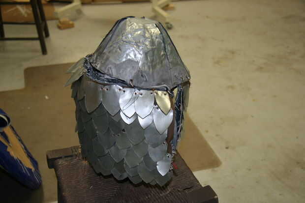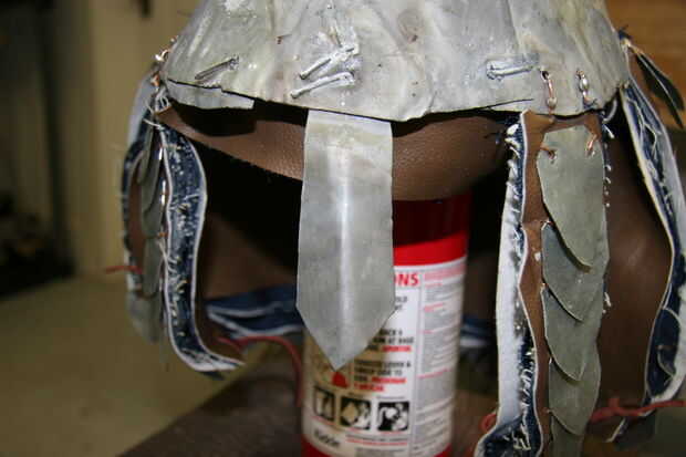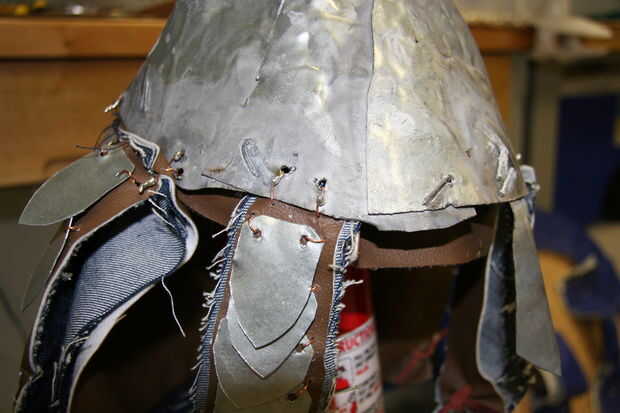 luego golpeó orificios en los bordes del casco y poner uñas a través de ellos entonces calentado y martilló los clavos para unir las piezas para que el casco no fan-out. también hice un pedazo de nariz y conectado de la misma manera