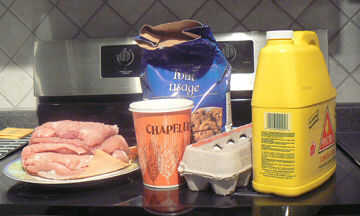Otros ingredientes son; aceite para freír, huevos, harina, lo que siempre te gusta especias y pan rallado. Dependiendo de cuantos escalopes que están haciendo, puede que necesite dos sartenes