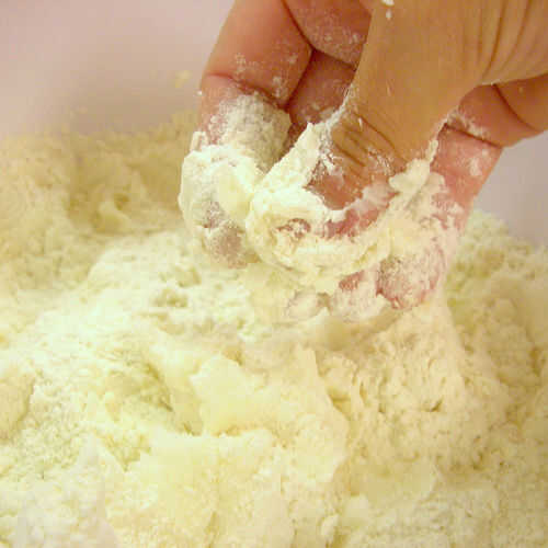 Ahora aquí es donde cortamos en el acortamiento. Algunas personas usan dos cuchillos, algunas personas usan dos tenedores, pero utilizo mis dedos. Sólo recoger algunos manteca y harina y desmenuzarlo. No utilice sus palmas o manos todas... que derretir la manteca y destruir su corteza. No amasar. Simplemente se desmoronan. Mover los dedos como han secado el pegamento de Elmer en ellos y tiene que bajar.