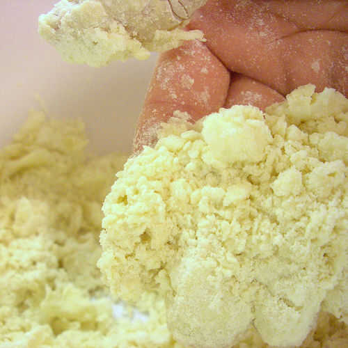 Como hacerlo, haz cubrirá cada bocado poco de manteca en la harina... debe buscar como pequeñas bolas pegajosas de masa. No un bulto grande.