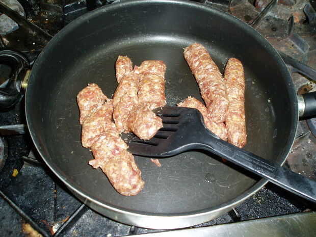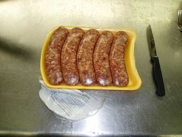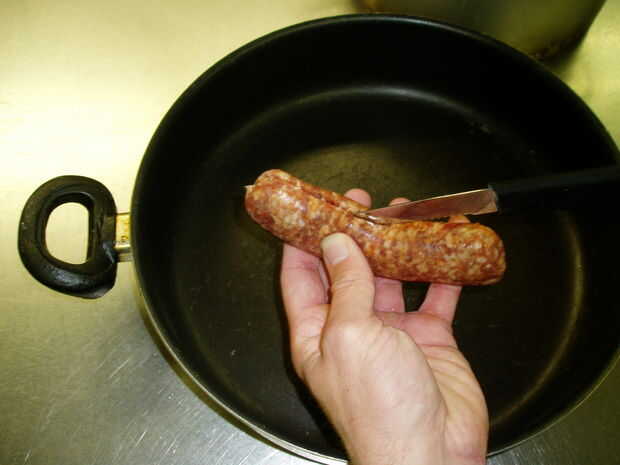 2. una vez que ha hecho el corte la longitud de la cuchara de la salchicha la piel y llevarlo a cabo. La salchicha permanecerá intacta; ahora lo coloque en la cacerola. Siga este procedimiento para el resto de los embutidos. Si usted ha comprado la salchicha en el mostrador de carne que no necesita hacer este paso. Simplemente puede abrir el paquete y colocarlo en la bandeja.