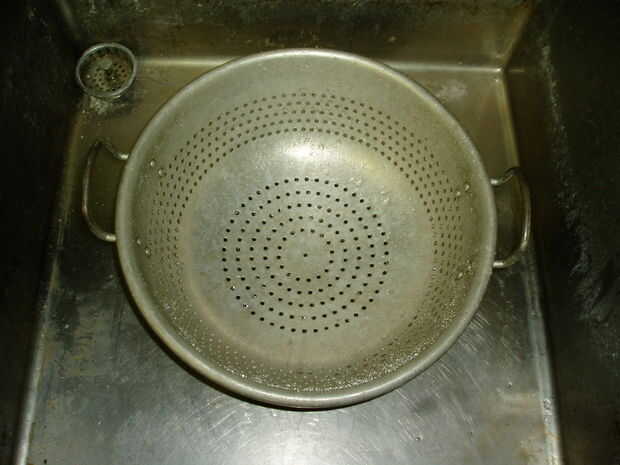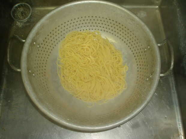 8. una vez que se coloque el colador en el fregadero y la olla de los fideos en la descarga.