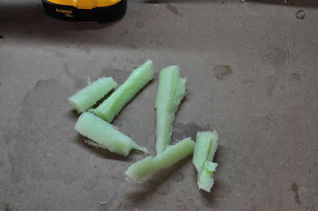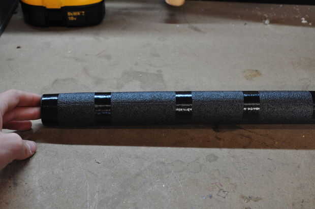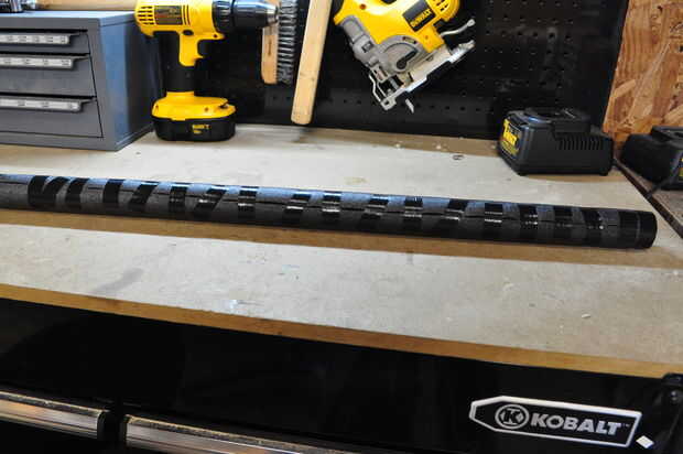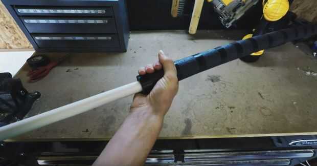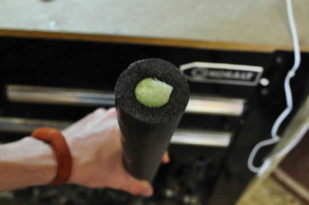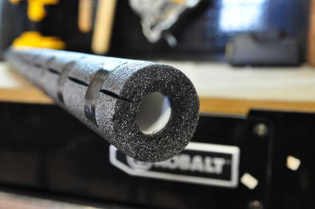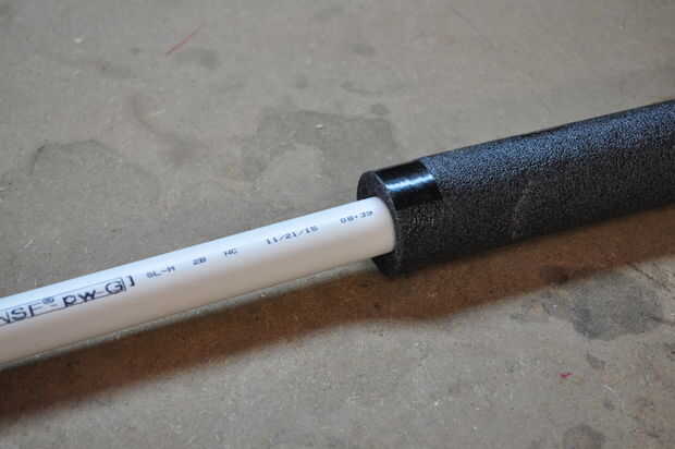 Ahora lo necesario para preparar la hoja de la espuma. En primer lugar, tomar el aislamiento de la pipa y corte a la longitud. La longitud debe ser por lo menos 1/2' (6 pulgadas) más corto que su base de PVC (la diferencia entre la espuma de la hoja y la base es cuánto mango llegar). Así por ejemplo, si su base es 3' de largo entonces sería cortar la espuma para ser 2-1/2' largo. Una vez que lo corte a la longitud, entonces cada par de pulgadas de cinta sobre la costura con cinta eléctrica y asegúrese de que inicie su grabación a nivel con un extremo de la espuma (esto va a ser el fin que va en el tubo primero).