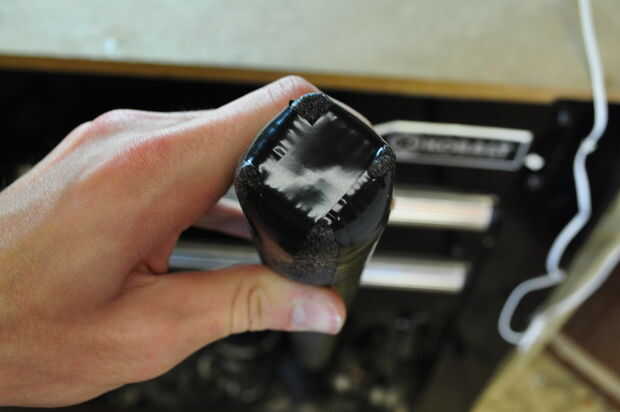 Una vez que hayas hecho esto usted necesita hacer un tapón en el centro de la tubería. El método que use para hacerlo puede variar. Encontré la forma más sencilla de hacerlo es pegamento caliente un centavo en un pedazo de espuma (como lo que se utiliza para sombrear cajas de herramientas) y recortar con tijeras (de esta manera habrá extra espuma alrededor de la moneda de diez centavos). Después el obturador hecho luego aplica pegamento caliente alrededor de los bordes y rápidamente la pegó abajo el tubo de la uña. Seguir adelante y marcar el extremo que se inserta el tapón a través ya que es el extremo que va a ser la manija.
