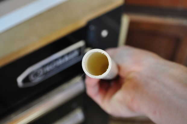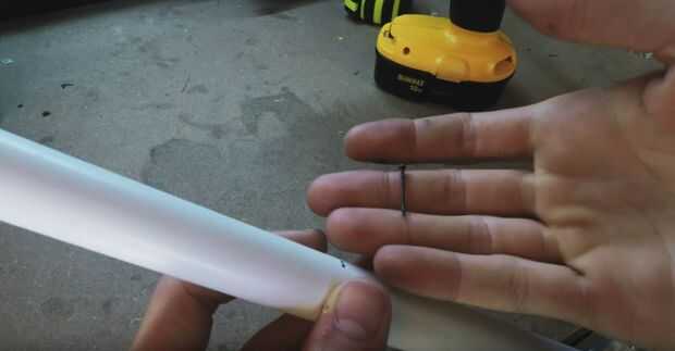 Todo dicho, lo primero que tienes que hacer es cortar el PVC a la longitud deseada (3' es lo que uso pero puede hacer lo que quiera, aunque no voy más de largo de 3-1/2') y el centro de la tubería. Si usas 3' de la pipa entonces se trata de 1-1/2' de un extremo. A continuación, perfore un orificio muy pequeño en el centro para dar cabida a un pequeño clavo. Si la uña pasa por el tubo entero entonces asegúrese de que usted corta y lijar al ras con el tubo.