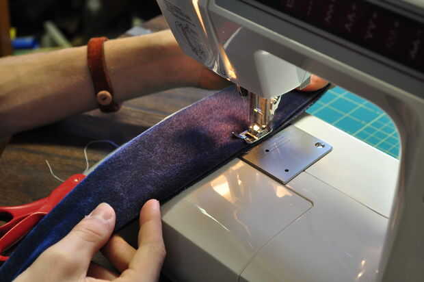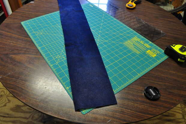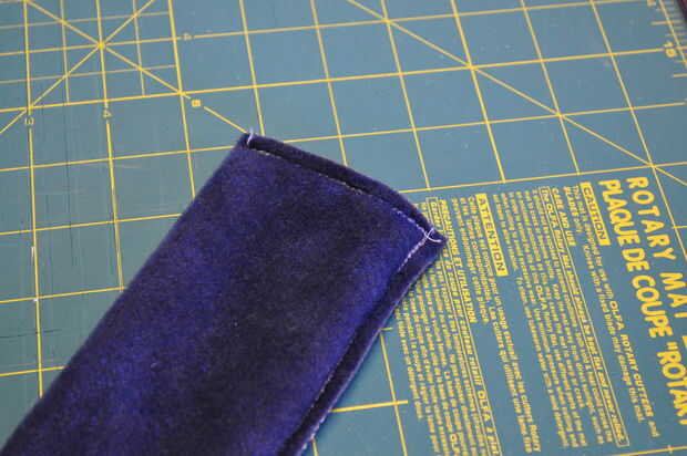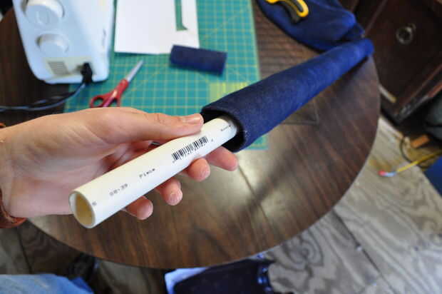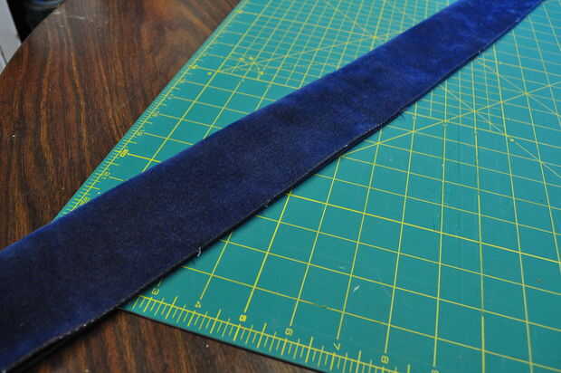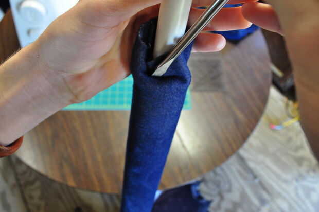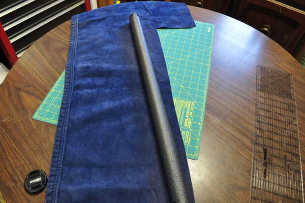 Para hacer la manga, primero asegúrese de que al menos un borde de su tela es estrecho y pone su espada paralela al borde. Luego doblar ese borde sobre la espada y se alinean para que tengas lo suficiente extra para coser luego. Una vez que tengas que marcado y corte entonces doblar la tira de tela por la mitad y coser una puntada "pesada" a lo largo de los laterales y borde superior de la manga. A continuación simplemente voltear la manga revés para ocultar las puntadas y tire de ella hacia la espada. La manga debe ser alrededor de 1-2" más largo que la hoja así que utilice un destornillador de cabeza plana embotado (o algo similar) para cosas toda la tela sobrante debajo de la espuma.