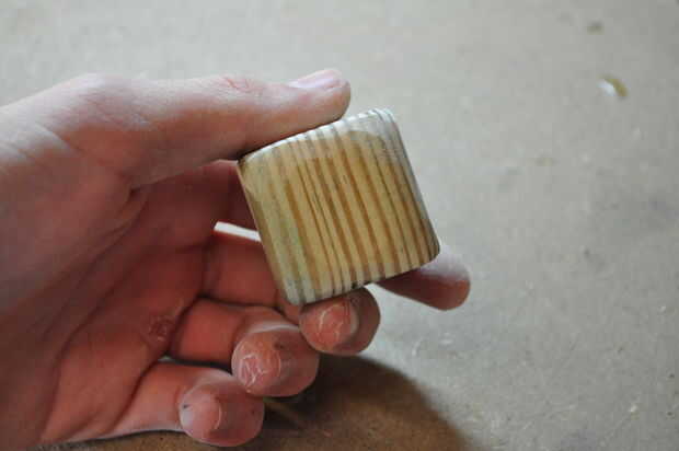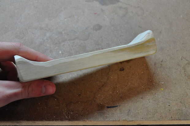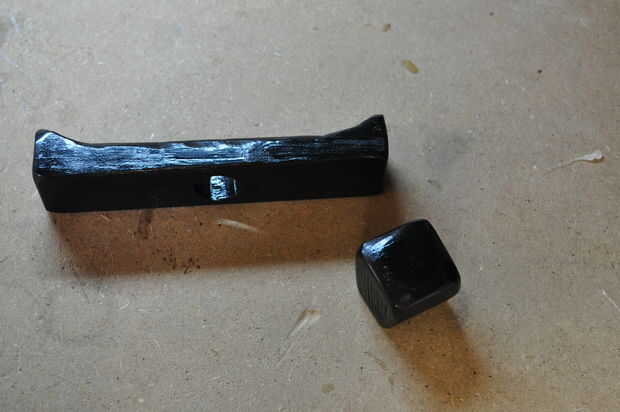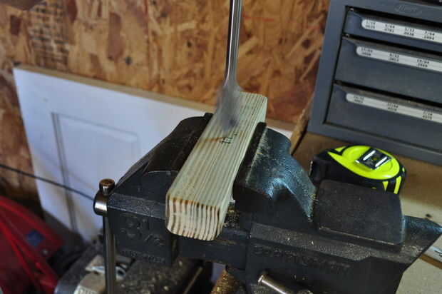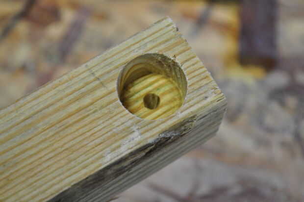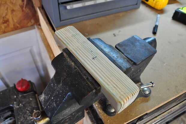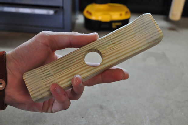 Para hacer el pomo, primero corte el final de la 2 x 4 para que tenga un 1-1/2 X 1-1/2 (o Compro stock que es ya que el tamaño). Luego dibujar una línea 1-1/2" del borde y otro orificio de 7/8" 3/4" profundidad de perforación 3/4" lejos del borde (el centro del bloque). Una vez que el agujero es perforado, cortado de la pieza en la línea de corte y utilice una lijadora de banda para redondear todos los bordes y dar el pomo de la forma deseada.