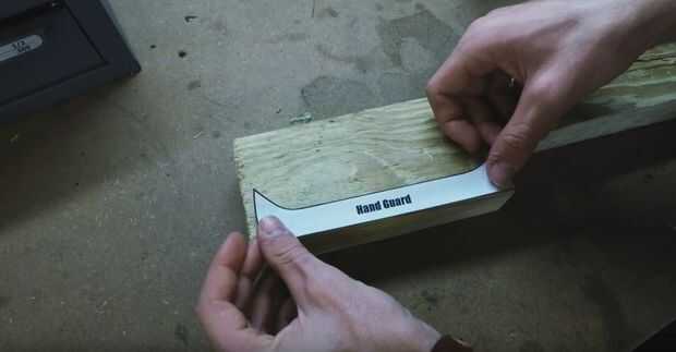 Para hacer la guardia, primero corte la plantilla (disponible en la lista de fuentes) y pegamento en el borde derecho inferior del 2 x 4. Después de que ha seleccionado, luego fijarlo con la abrazadera inferior hasta en la prensa y perfore un orificio de 7/8" en el centro exacto de la pieza. Una vez tuve que hacer redondean todas las esquinas y bordes con mi lijadora de banda y le dio unas cuantas capas de pintura en aerosol negro brillante (yo no tenía ninguna plata en mano). Recuerde que si usted no los cantos bien entonces la Guardia puede rasgar para arriba la manga de tela en espadas del otro luchador.