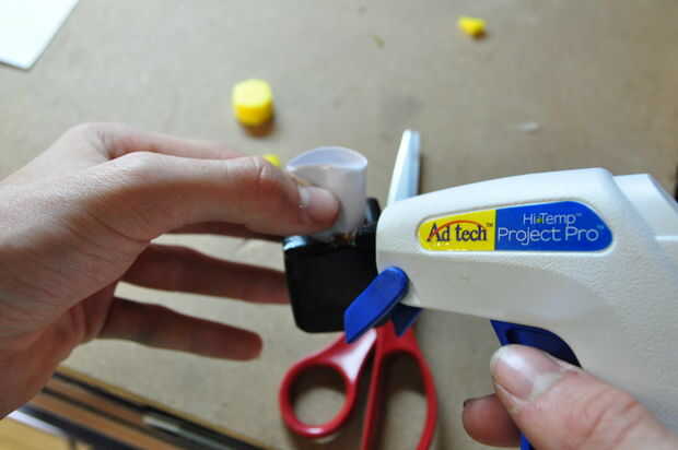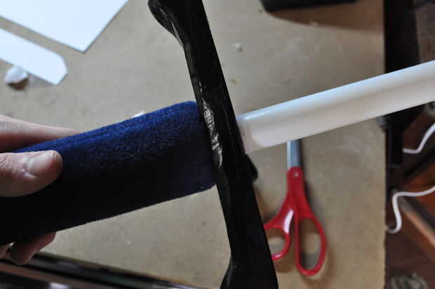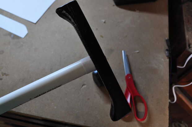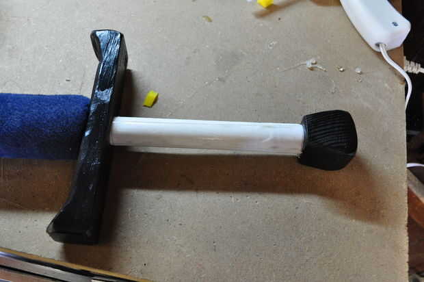 Para el pomo, otro tubo de papel del pegamento en el agujero y luego deslice parcialmente sobre el mango, agregar pegamento frente el papel luego continúe deslizando hacia arriba tanto como sea posible (si el tubo de papel se derrumba inténtelo de nuevo). Una vez que el pomo, luego taladre un orificio muy pequeño a la mitad de la guardia y golpeo e Inserte un clavo pequeño con poco de pegamento en el agujero. Esto completa el montaje de la empuñadura y si se hace correctamente la guardia ni el pomo debe tambalearse o spin.