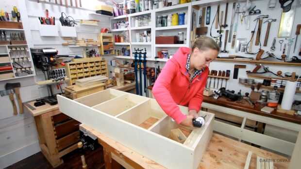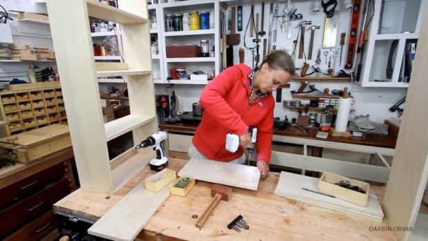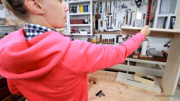 También necesito poner unas tiras clavadas por lo que puedo conectar la unidad a la pared. Estoy instalando dos en cada sección, uno en la parte superior y uno en el centro. Y ahí tienes una, completa. Ahora para llevar a ese mismo aspecto en todo, estoy asegurando una tira de clavado a los estantes individuales para la sección central, para dar la ilusión de una pieza superior transparente.