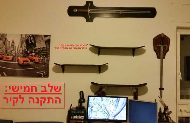 mi patineta era siempre en la forma así que decidí colgarla.  Mina he colgado en el techo, pero estoy seguro que este estante puede ser montado en la pared.  Usé un tubo de PVC negro y knotched que, luego, usando un pedazo de madera, attaced a la car