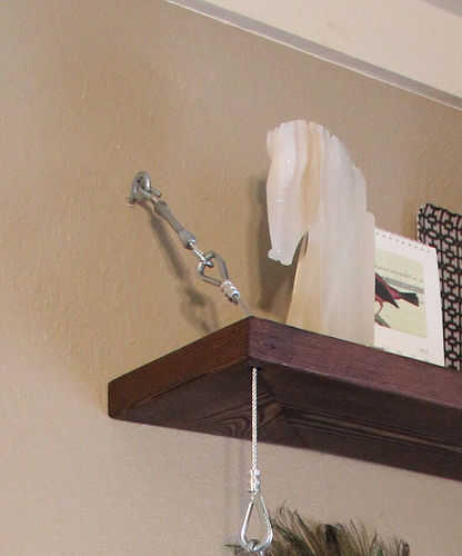 En la parte superior de los estantes, os adjunto los pernos de ojo grande para llevar la mayor parte del peso de las estanterías. Por favor, asegúrese de que encontrar un lugar seguro para colocar éstos. En la parte superior de la mayoría de paredes que son 2 x dos 4 apilados que corren horizontalmente. Este es el lugar ideal para probar y puede ayudar a evitar que su diseño determinado por el espacio de tus tacos.