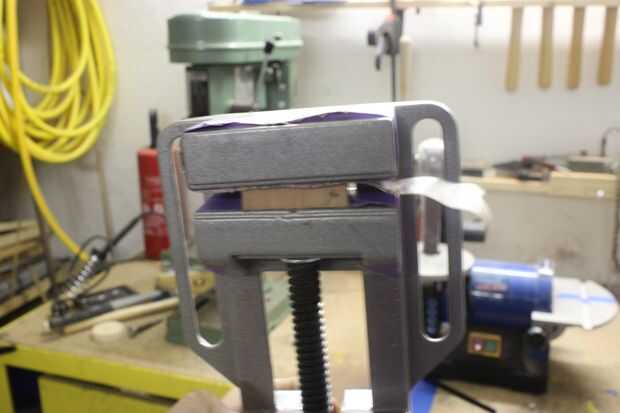 Al perforar el agujero sujeta la pieza en un torno. Usé algunas cintas para proteger la pieza de la sujeción de los tarros.
