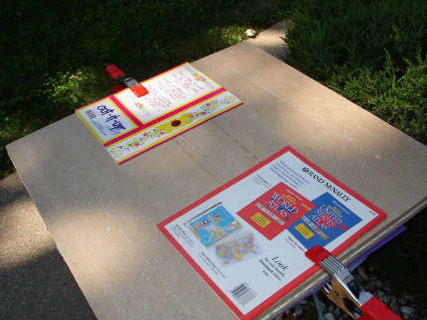 Pegar dos azulejos del techo junto con pegamento de madera. Unir los lados blancos ásperos. Ser generoso con el pegamento. Pinza para sostener la orientación. Coloque los libros entre las abrazaderas y las tejas del techo para no dañar los azulejos. Cortar a la tela mientras se está secando el pegamento.