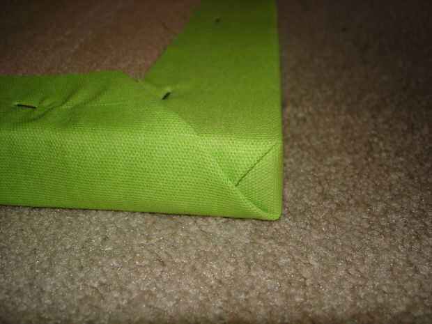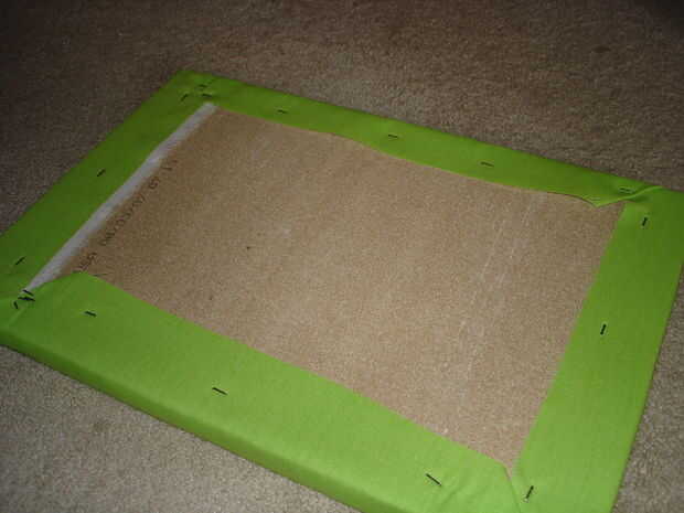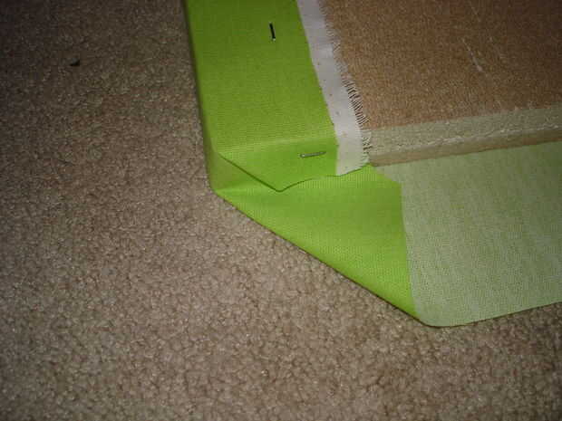 Engrape la tela a la tabla de espigas: Centro de la placa en su tela. Este paso es más fácil mirar las fotos para entender. Comience en el borde superior y de la grapa en el centro de la tela sobrante. Tire de la tela y de la grapa en el extremo inferior. Grapa en lados alternos (3 grapas por cada lado), manteniendo la tela enseñó. Doble las esquinas hacia abajo como se muestra. Grapas en el lado del tablero de clavija para sujetar a la tela al ras. Recorte a cualquier exceso tejido. Tire de la tela de los lados en la parte posterior de la Junta de perno y grapa. Para ello de las cuatro esquinas. Engrape los opuestos lados de la misma manera la parte superior e inferior.