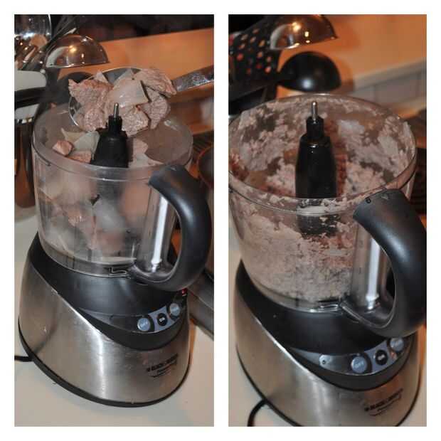 Una vez que la carne y la cebolla estén cocinada, necesita sacar su procesador de alimentos. Usando un cucharón, sacar la carne de res y ponerlo en el procesador, pero asegúrese de drenar el agua primero. Intente su mejor para tomar sólo la carne y unos trozos de cebolla. no quiero tener ardor de estómago! Cortar la carne hasta que no hay trozos grandes y se mezcla bien con las cebollas.