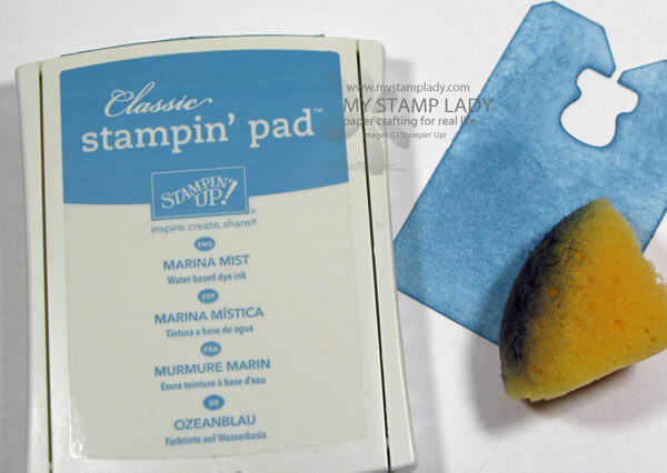 Cortar una etiqueta. Utilicé los Framelits platica, pero usted puede hacer cualquier forma. La etiqueta con tinta para darle algún color de la esponja.