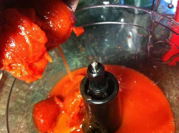 Vaciar los tomates enteros enlatados en el procesador de alimentos.