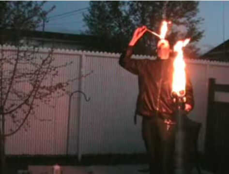 Te sugiero que llegar a cómo la sensación primero apagado. sería más seguro. Si usted nunca malabares con fuego antes, tratar de acostumbrarse a tener esas grandes llamas a tu alrededor por que hace pivotar y tirar primero solamente una antorcha. Cuando se sienta que listo, hacer malabares con los tres!